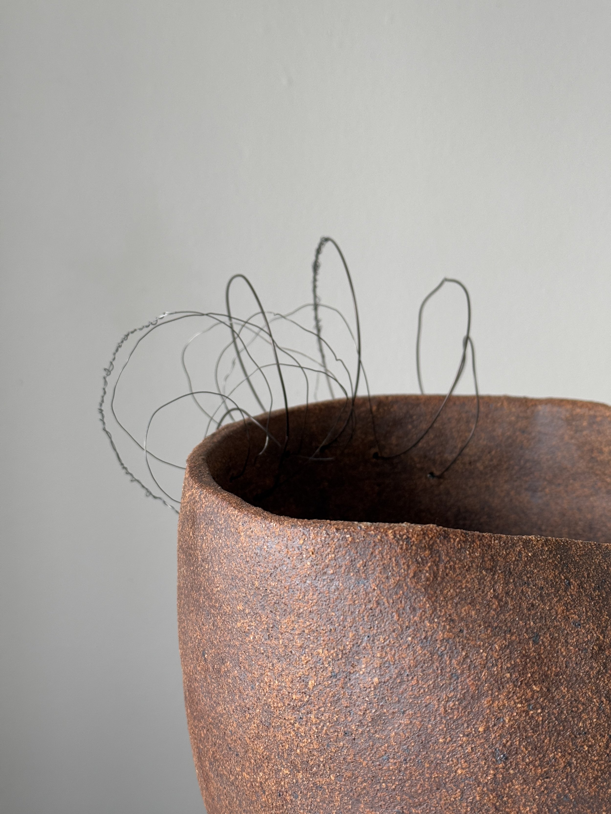 Large sculptural vase with wire detail. Hand built using clay coil from red stoneware clay. Fired at 2381 degrees Fahrenheit.